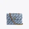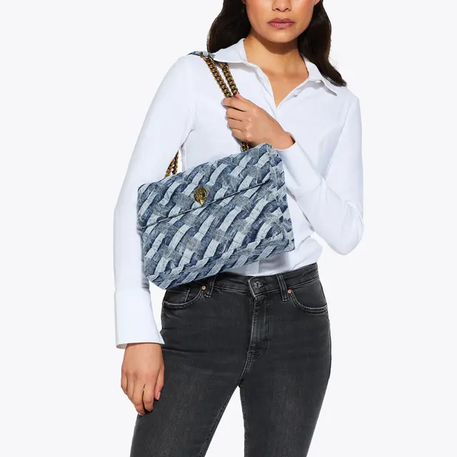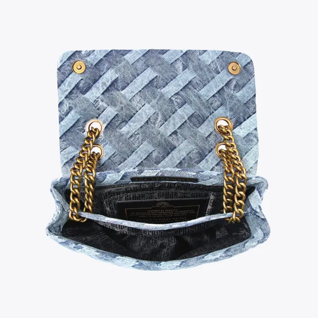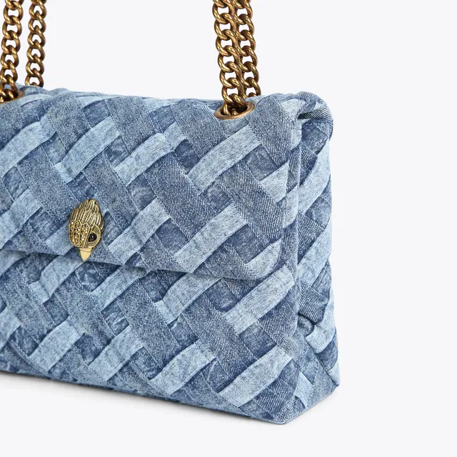 The Kensington Soft is crafted from an acid wash denim in weave print. The antiqued brass Eagle head features crystals and black bead eyes on the front flap.