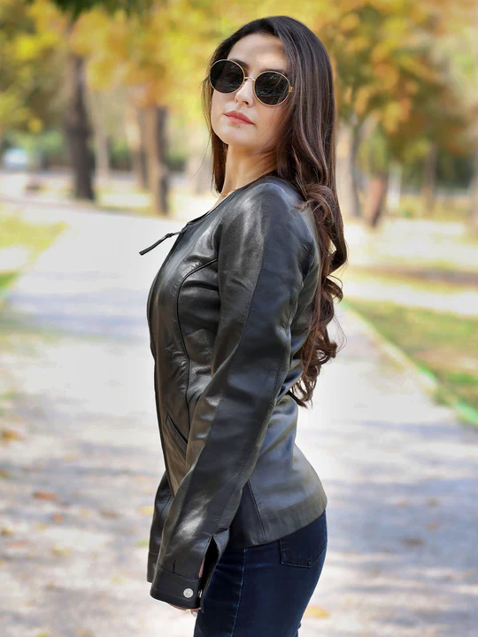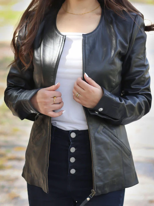 Show off your funky side with this super cool Lightweight Women Leather Collarless Jacket. It is supposed to be in every woman’s wardrobe to make them look extra stylish and elegant. It comes in two colors, Black and Red. The unique Round collarless neck is the highlight of this jacket and is aimed to make you a casual yet chic vibe. YKK zipper is accompanying the matching zipper holder for a convenient zip up. Flaps style on the zipper is all set to help you create a new fashion statement. Two Jetted pockets on the waist sides add to its refined elegance. It has got high quality strong buttons on the wrists as well.