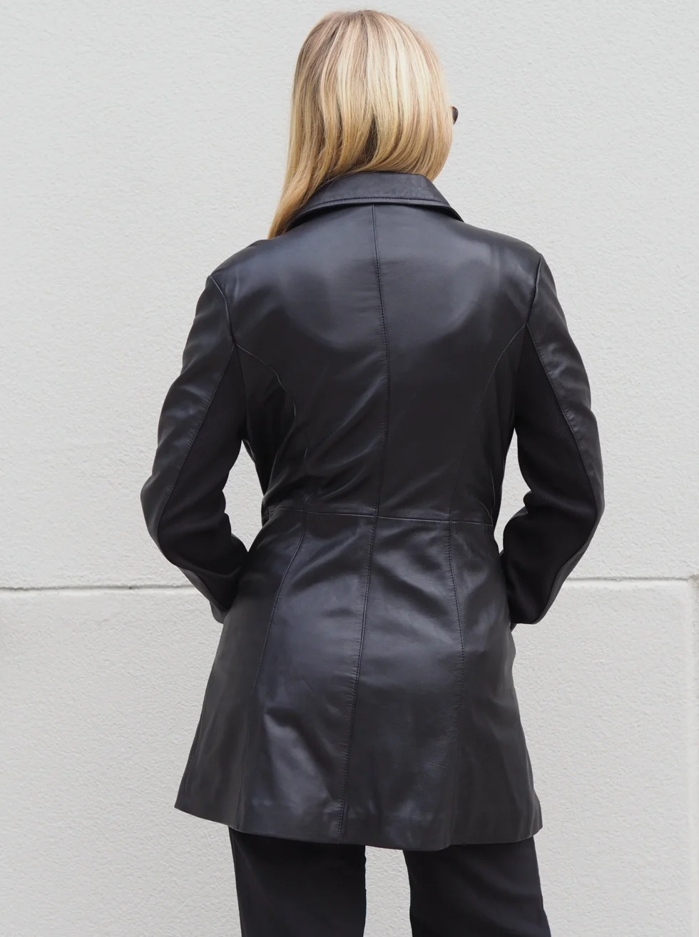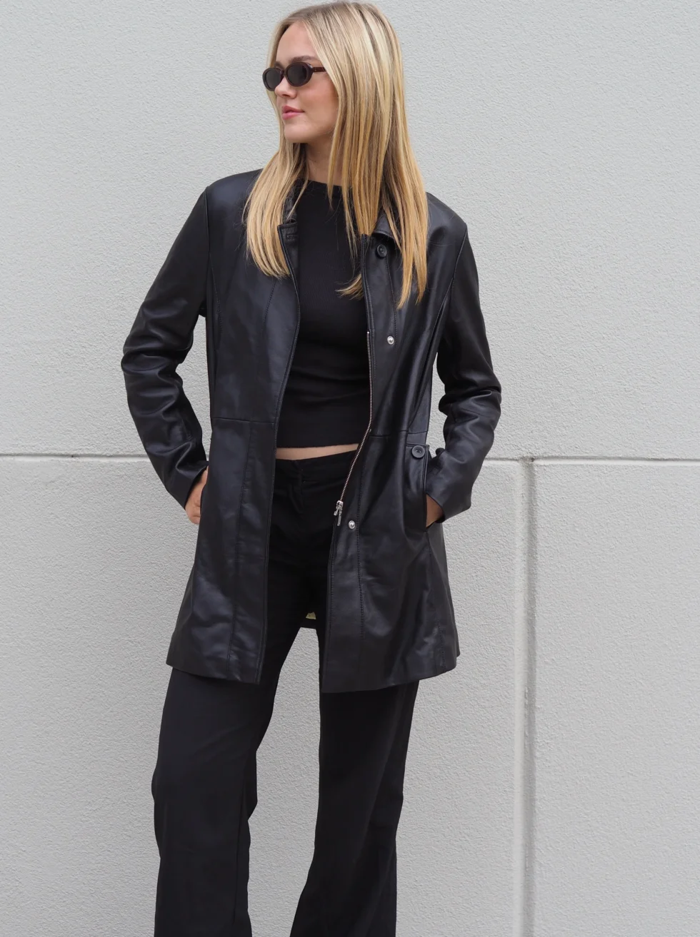 A simple yet stylish mid length leather jacket that is perfect for those colder months, or throw over your shoulders on a balmy summer evening