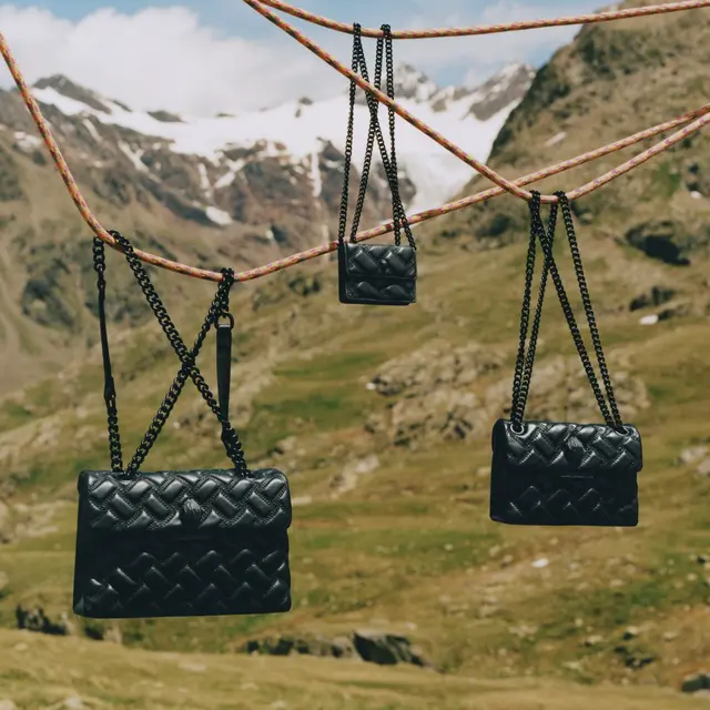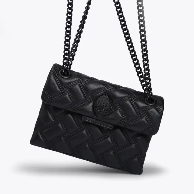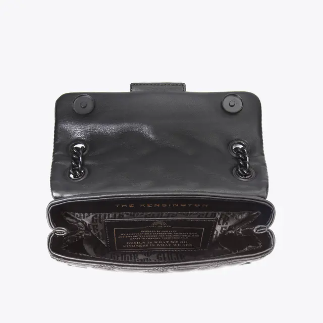 The Mini Kensington Drench Bag is crafted from a soft lambskin leather with signature parquet padded overstitch quilt with three rows of weave pattern. The black metal Eagle head features jet black crystals and black crystal eyes on the front flap.