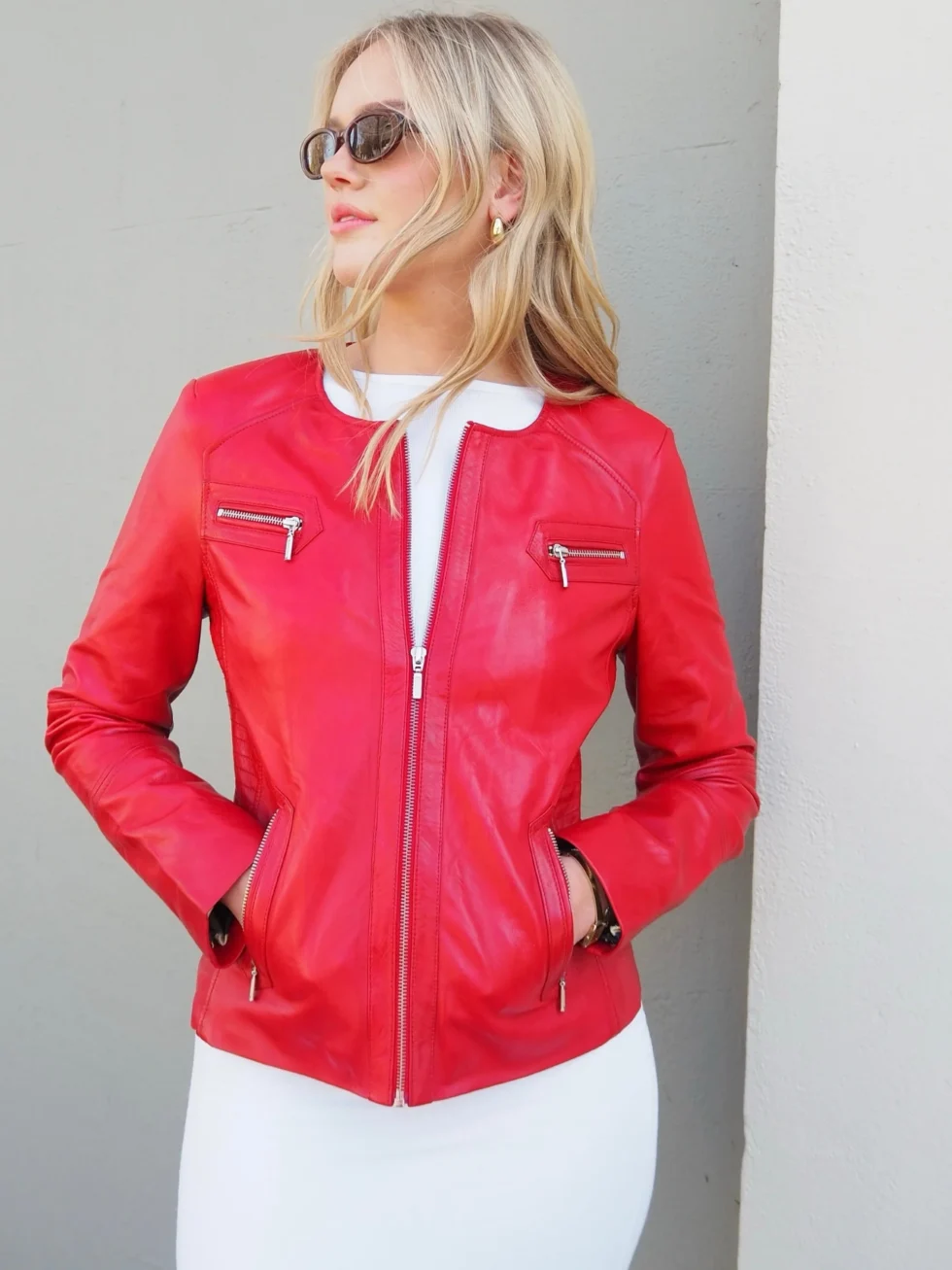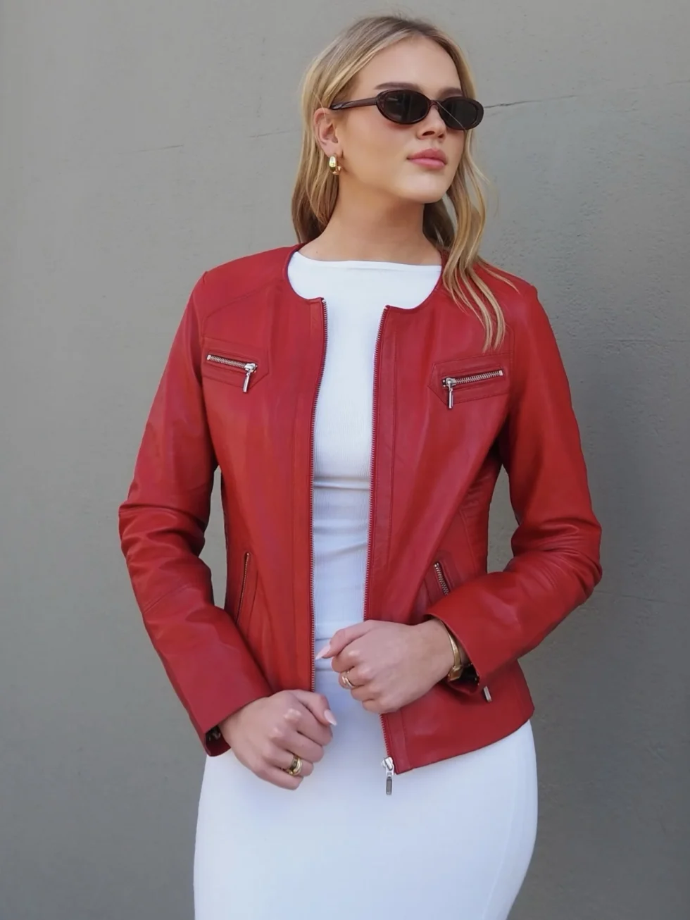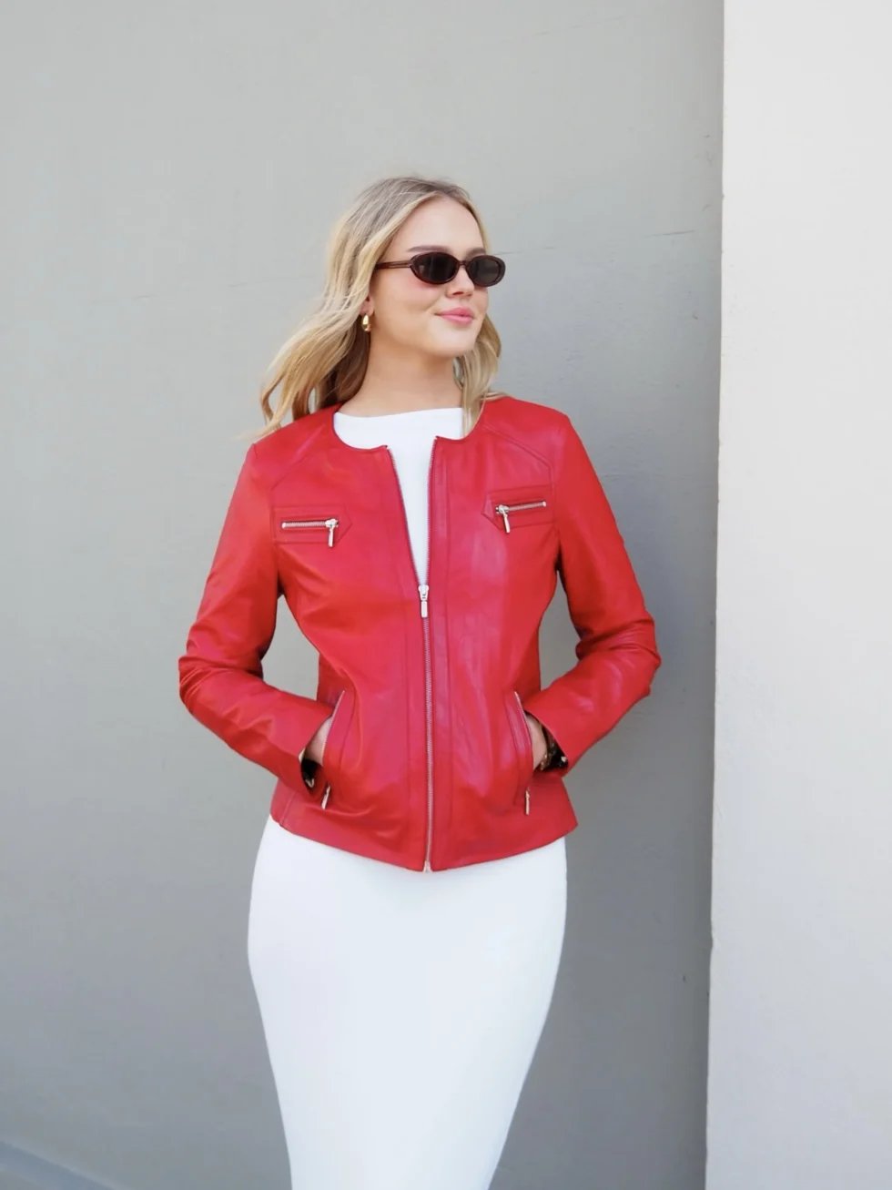 The New York jacket is a classic style with an edgy twist, perfect for day to nightwear. It’s made of super-soft leather, and it features 4 functional zip pockets on the front, semi-structured shoulders and stitch detailing on the side panels. The New York jacket is the perfect companion to all your wardrobe staples, as it transitions beautifully from day to night- wear it with your favourite jeans, or the perfect Saturday night party dress.