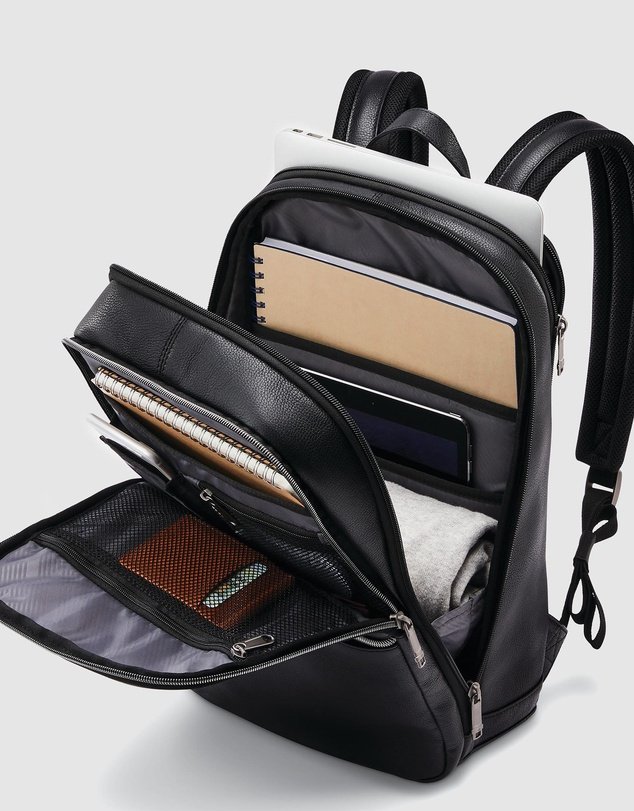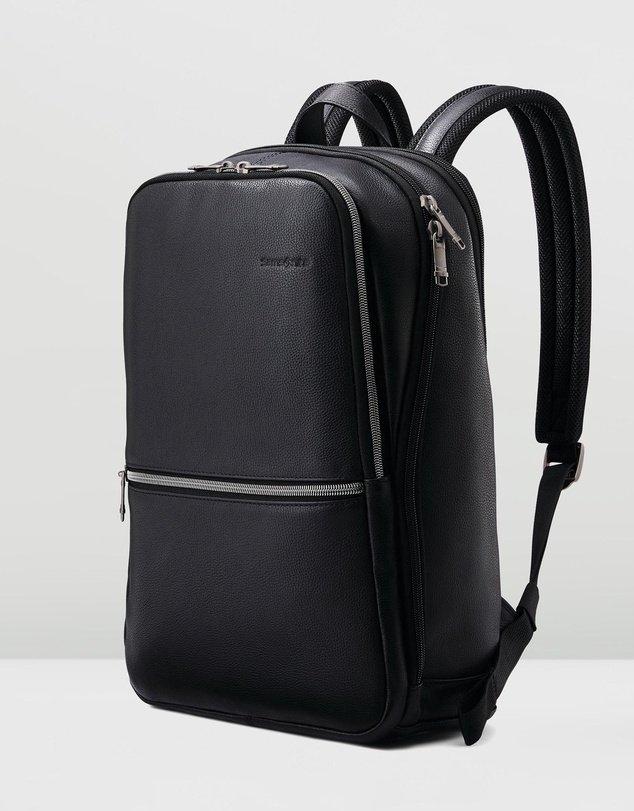 The Sam Classic Leather Slim Backpack by Samsonite Business is a sleek everyday bag with enough room for a laptop, documents and other daily essentials.