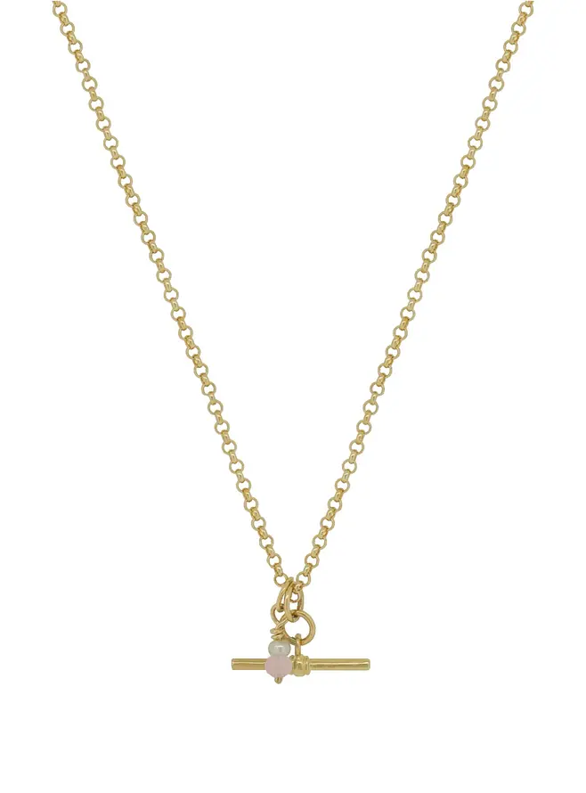 The captivating fob tbar featuring a gorgeous rose quartz and pearl drop, will adorn your neckline with grace and allure.