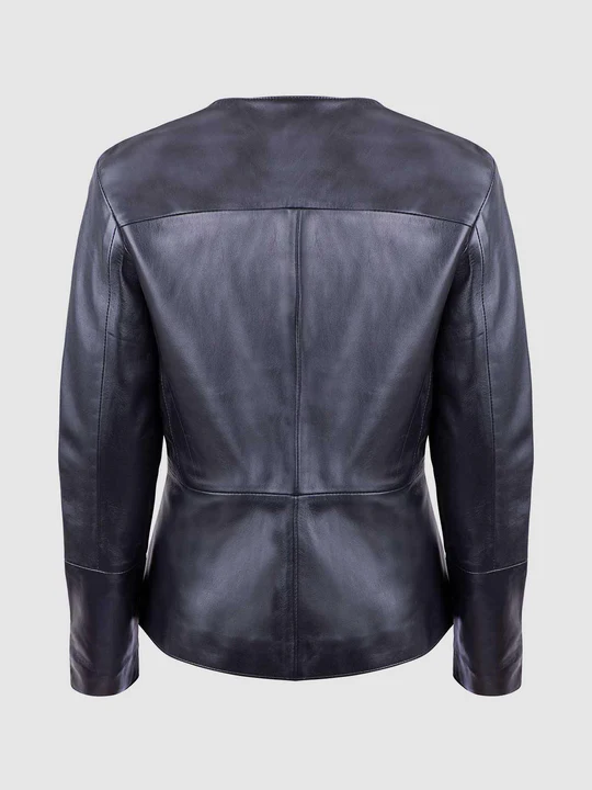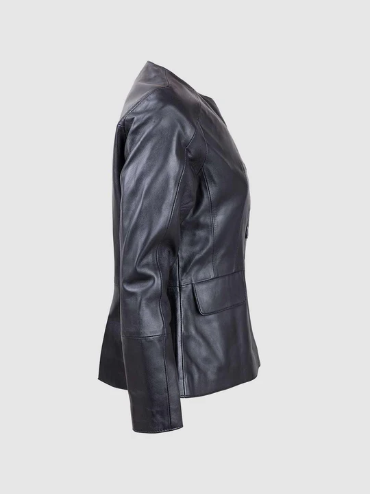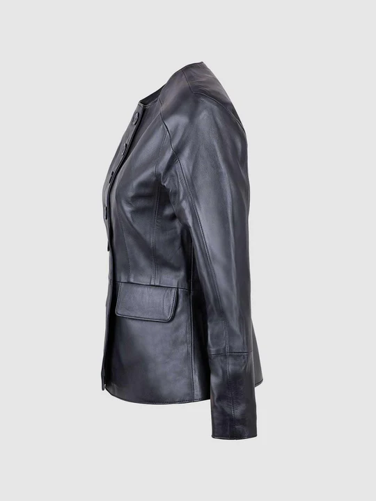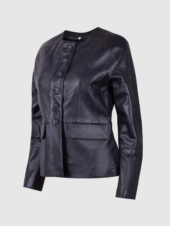 Sleek cuts and design on the back adds versatility to its beauty. The Button Closure Leather Jacket has a round collarless neck with the buttons on the front. Flaps with the pockets make it look more smooth and refined. This trendy piece of clothing is made with best quality leather.