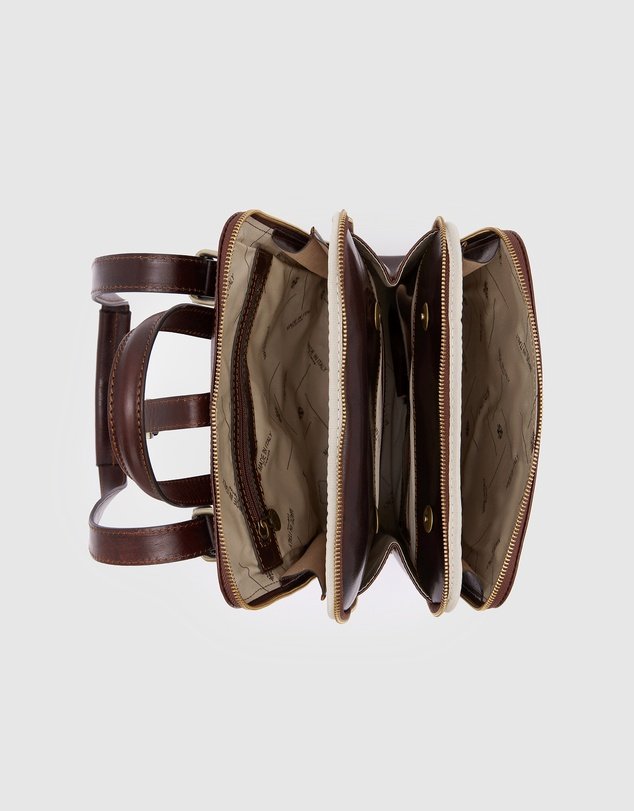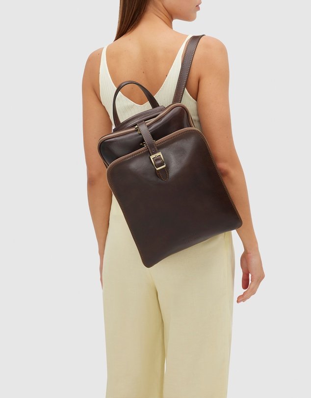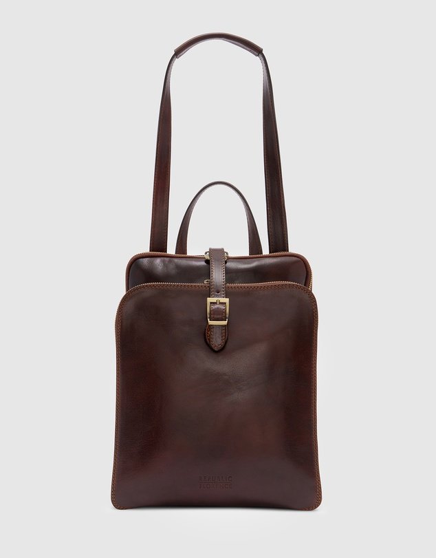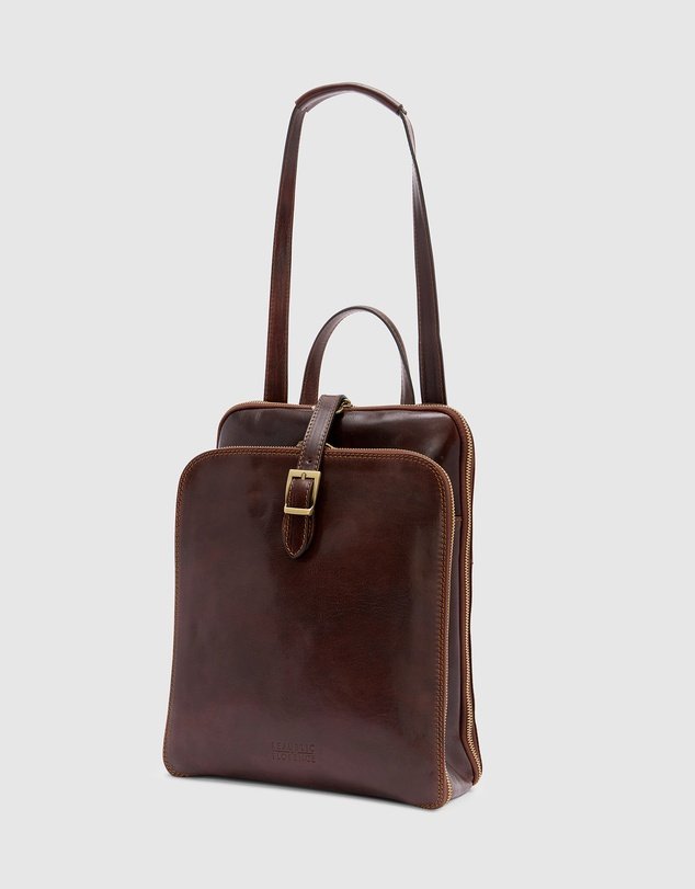 Made in Italy from high-quality leather, the Emma bag from Florence exudes perennial sophistication with its multiple compartments and buckled strap closure. Wear as a backpack or as a shoulder bag by pulling the shoulder straps. Fits most 13′ laptops.